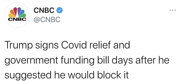美国消费者新闻与商业频道(CNBC)也最新发布消息称,美国总统特朗普已签署新冠纾困法案及联邦政府综合支出法案。